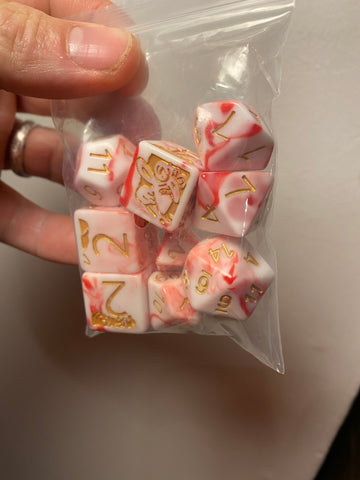 Want to up your game? Or at least look good trying? Snag these while they last... super limited red/white marble dice with custom Agatha heads AND an embroidered dice bag.